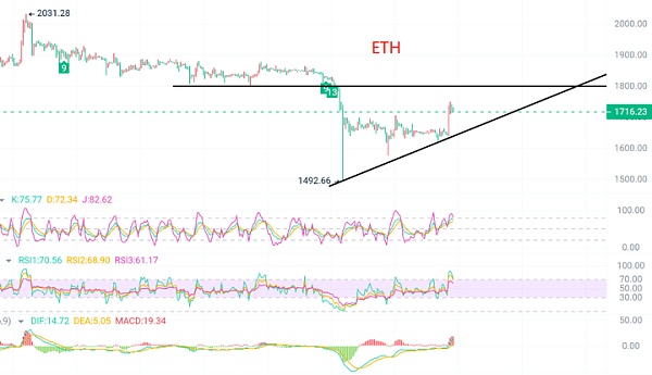 以太行情经过多日来的盘整修复,在昨天晚间终于走出一波大的反弹,连续突破上方高点压制,最高涨至1746附近,日线有出现底背离的态势,突破上方1700,就要关注到1720和1745附近的压制。4小时线,昨天晚间及凌晨的一波拉伸,连续突破上方斐波那契回撤线的压制,而长路有说到过这波反弹需要突破上次下跌大阴线的二分之一1745附近的压制,才能确定上涨趋势,而昨天的拿一波反弹虽然有一波大的拉伸,但并未顺利突破1745的压制回踩,刚刚行情跌至1.13假突破位置今天操作上建议,先看回踩,不破下方支撑再考虑多单进场,行情一波大涨后,有震荡修复的趋势,白盘会以震荡为主。