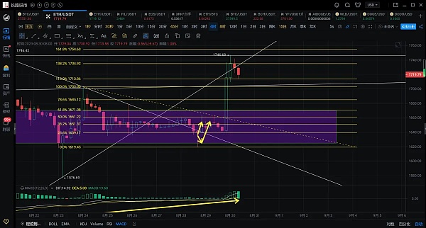 以太坊行情分析:行情经过多日来的盘整修复,在昨天晚间终于走出一波大的反弹,连续突破上方高点压制,最高涨至1746附近,而长路在最近几天的行情分析中都有指出,日线有出现底背离的态势,突破上方1700,就要关注到1720和1745附近的压制,果然多日以来的等待,终于走出,行情不会缺失,只会迟到。昨天行情的这波反弹,顺利的站稳了周线下轨的支撑,有继续向上突破的趋势,而日线方面,前天行情走出长下引线十字星,昨天的一波大涨,有走出启明之星的趋势,而受到上方日线中轨的压制,价格若能顺利站稳中轨支撑,那么将有机会继续反弹,若是跌破,那么将有机会继续测试下方5/10均线1690附近的支撑。