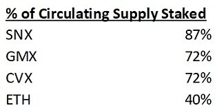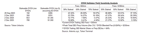 根据当前的 DYDX 手续费(5000 万美元 ——过去 30 天手续费年化),我们估计从第一天开始,验证者的质押收益率将最低达到 15%(假设所有流通的 DYDX 都被质押),但更可能接近 20%(假设质押的代币比例与其他高手续费增长代币(如 SNX、GMX 和 CVX)相似)。此外,我们认为这个手续费金额是在交易量低谷时的估计,并预计在投机需求回归时交易量将会上升。目前,永续合约去中心化交易所的交易量约为历史高峰(2022 年 2 月)的 30%。尽管如此,考虑到永续合约去中心化交易所的渗透率现在更高,并且在不断增长的中心化交易所恐慌情绪背景下可能会进一步提高,我们认为合理地假设年化手续费在上涨的市场中可以达到 1 亿美元(甚至更高)。