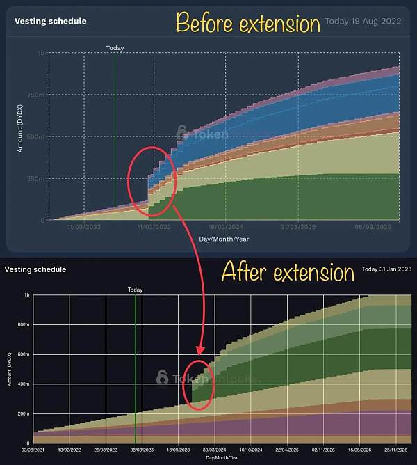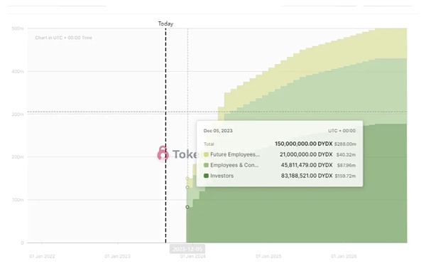在 2023 年 12 月 1 日解锁的 1.5 亿 DYDX 代币中,有 30% 属于「员工和顾问」。我们已经看到了这种情况的先例,因为之前的解锁已经推迟,以更好地与延迟的 v4 的时间同步;很可能是为了确保代币供应与价值累积后的需求之间有良好的交集。