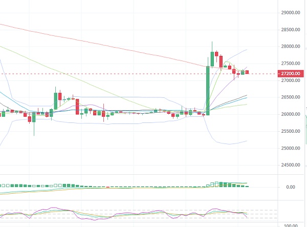 比特币的走势在前日冲高之后短期形成了阴跌状态,持续的震荡下行,目前整体给到了近千点的回调空间,昨日低位最低来到27000一线附近后走出小幅反弹,目前运行于27200一线,昨日的文章思路中我们也是给出了回调做多的的建议,行情的走势也比较配合,给到了进场位置。目前四小时结构图来看,布林带开口呈喇叭状向上发散运行, K 线运行于布林带中上轨通道内, MACD 多头能量柱呈阶梯式放量运行,对于技术结构而言短线已经破位有效压制位进而打开空间,久盘之后的破位放量还是较为符合预期,日线突破中轨并启稳,小周期内整理后蓄势大阳放量,各趋势明显多头强势,就目前趋势来看,回调力度太过弱势了,多头再次冲击30000上方将指日可待,后续多头将持续发力,日线级别币价已站稳中轨上方, V 反必将完成,多头动能也开始持续发力, 日内继续保持回调做多思路进行。