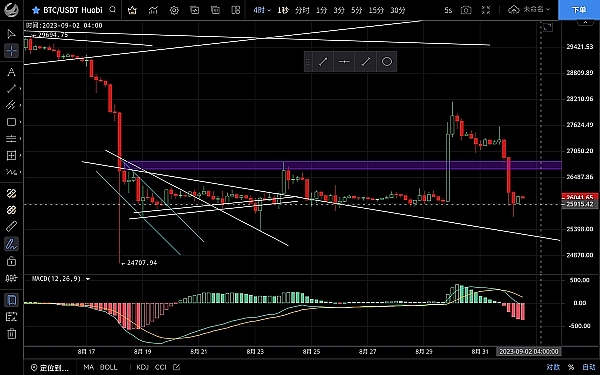 大饼昨日高位触及27593一线受阻,随后空头发力加速下跌至25653一线支撑,恭喜跟上昨日思路的朋友空单获利1000余点,目前币价在26040附近运行,四小时级别行情画门再次跌回到起涨点,macd空头运行双线死叉向下,ma7均线拐头向下指引,短期虽止跌反弹,但力度不大,预计会走一波震荡修复,日线级别k线收大阴再次试探25600支撑,整体来看空头趋势仍在,前期文中提及反弹就是高空的机会,把握住的币友有不错的收获,后市思路依旧反弹高空为主低多为辅,上方压制26300-26700,下方支撑25600-25100
