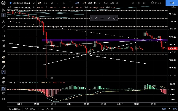 以太坊昨日白盘横盘蓄力波动不大,直到晚间一波拉升最高触及1728一线受阻回落,随后空头发力加速下跌最低至1630一线支撑反弹,恭喜跟上昨日思路的朋友空单获利80点,目前币价在1650附近运行,四小时级别空头逐步放量双线死叉向下,均线保持向下释放,短期还有回调空间,整体走势和大饼相同,再次陷入弱势,白盘预计不会有太大波动以震荡修复为主,技术结构来看日线收大阴,反弹力度较弱,技术指标偏向空头,有再次试探1618支撑的需求,破位将延续下行,思路建议反弹高空为主低多为辅,上方压制1660-1680,下方支撑1620-1600