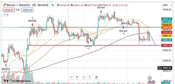 比特币昨日白天处于窄幅震荡,晚间触及27600一线承压急速下跌,今日早晨最低25655一线企稳反弹,24小时机构净流出3.35亿美金。日线级别来看,昨天收一根阴大阴线,K线形态上再次形成连阴下跌,附图MACD指标双线绿色动能柱缩量运行,显示出强烈的看跌信号。当前,四小时级别BOLL指数在下轨附近运行,附图MACD双线死叉向下的状态,MA7、MA30向下指引。KDJ三线延伸死叉向下态势,D值在20轴附近震荡处于超卖区。根据技术指标的分析,上方压制明显,多头在前日触及28163未能继续上行,选择继续回落筑底。我们建议采取反弹高空的策略,可以在26500-27000的价格区间入场做空,激进派26300空进去,目标25300。