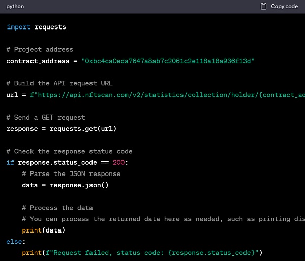 在这个示例中,我们使用 Python 的 requests 库来发送 GET 请求,获取 NFT Collection 的 Top Holder 分布数据详情,请确保已经安装了 requests 库,来根据需要进一步处理响应数据,例如提取和分析持有者的信息以及 NFT 的分布情况。NFTScan 为开发者统一封装链上数据,提供完整的响应格式说明,开发者无需关注底层实现细节,大大降低了获取 NFT 数据的门槛,使构建 NFT 应用变得简单高效。