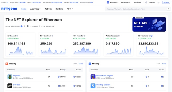 就 Ethereum NFTScan 数据来看,目前以太坊上共产生:NFT 合约数量 259,229;NFT 资产数量 146,341,468;NFT 链上记录数量 252,387,389;NFT 交互钱包地址数量 9,828,744。