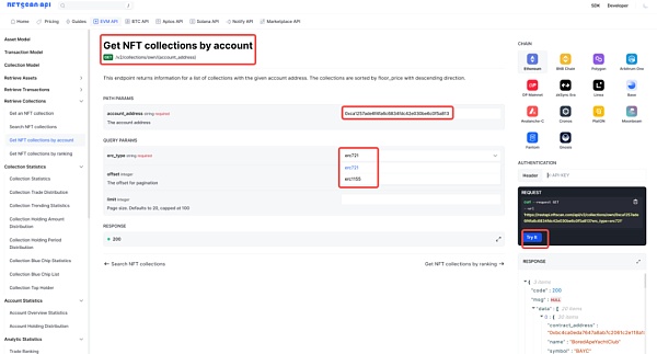 构建 NFTScan 相关 NFT 数据请求非常简单方便,开发者只需要在详尽的 API 文档中找到所需的接口,根据接口说明配置必要的请求参数,使用代码或 Postman 等工具按文档示例快速发起请求,就可以获取丰富的 NFT 数据,无需处理繁琐的链上提取和数据整合。