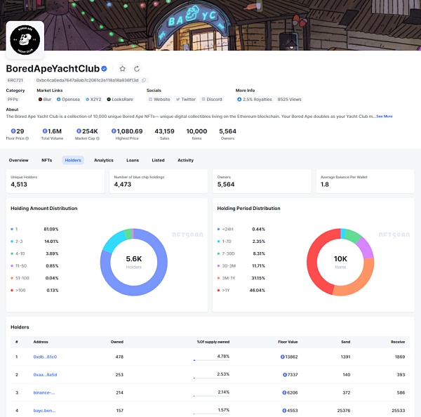 /v2/statistics/collection/holder/{contract_address} 接口返回指定集合中持有者按照持有量排序,以及持有的该集合中的 NFT 数量和持有时间的分布描述,能够帮助分析集合的持有者分布情况,判断市场集中度,是进行集合级别研究的重要数据来源,可以参考 NFTScan Holders: