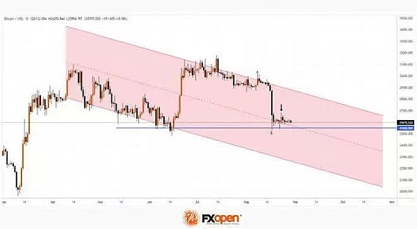 截至8月26日,所有交易所的比特币交易量约为130k,交易量下降或许是由于加密货币监管的不确定性导致兴趣下降,或者是由于2023年初开始的看涨趋势消退。摩根大通分析师表示,未平仓合约的减少可能表明比特币的价格已接近显着低点,但比特币/美元图表表明看跌趋势可能会持续。下降通道表明了这一点,其轮廓正变得更加清晰。