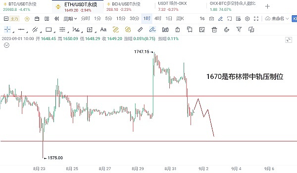 怎么上去就怎么下来,币圈行情喜欢过山车,大饼的这波下跌已经破掉前面起涨位置25900,凌晨以后直接来到25600一线,目前反弹到26000横盘整理。思路上不用说,反弹继续空为主,白盘小时线略带有反抽迹象,MACD指标金叉,KDJ三线向上发散,空头量能在减弱,大饼建议反弹到26500附近,布林带中轨位置去空,目标看25600—25000;以太小时线布林带中轨位置在1670附近,早间行情走出企稳,小周期5分钟级别处于横盘姿态,超跌过后需要修复行情,预计有一波小反弹,建议1665—1670附近空,目标看1630—1600。