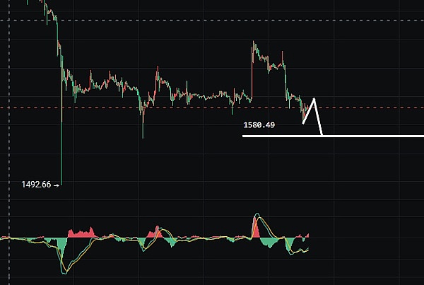 以太坊。日线延续大阴探低,利好因素伴随ETF的推迟仅是虚晃一枪,币价一度从哪里起涨,乃至跌至于起涨下方。小时图来看,价格多次试探中轨就屡遭棒喝,午夜更是深度回踩1600附近再次防守,主图20/30均线压制明显,低点突破不断下移,今日思路李隆建议保持高空为主,进场切记做好分批计划。