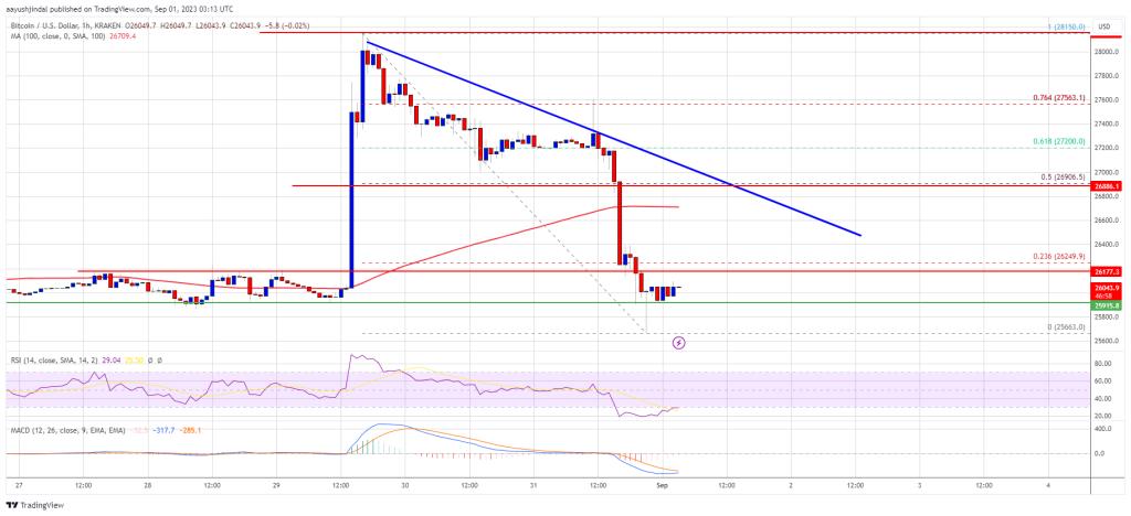明显跌破 26,200 美元水平。价格甚至飙升至 26,000 美元以下。25,663 美元附近形成低点,目前价格正在巩固跌幅。比特币目前交易价格低于 26,600 美元和 100 小时简单移动平均线。
