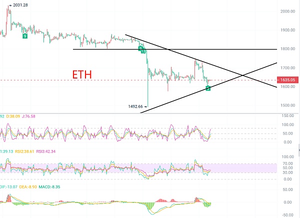 以太4小时价格走势价格已经有效跌破由1575至1620形成的拐点上升趋势线,三均线正式进入死叉阶段10-15ema开始向下压制;短期第一阻力较为明显1660-1670;之下为空头方向;1小时级别关注由1730至1600斐波段的回撤比例38.2%-50%【1650-1665】在该区域之下寻找反弹后出现的受阻信号尝试空头介入;防守至1670之上+;目标先看1580-1570;强势破位再看至1500!