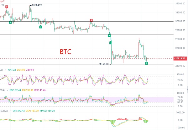 从大级别周期来看,大饼已经三连阴并抹平了前天因消息面所带来的上涨。从裸k上来看我空头趋势依旧明显,但在25000附近,具有很强的多头力量,也是我们的区间之间,25000-31000导致大饼始终无法进行有效的下破。四小时级别行情暂时止跌,macd空头逐步缩量双线仍是死叉,短期关注ma7压制情况,若突破有机会走出一波反弹行情,日线级别多头缩量双线粘合,日内波动较小整体走势保持平稳,短期虽看反弹但因周末预计不会有太大波动,附属指标死叉向下,短期内依旧是一个下行趋势。