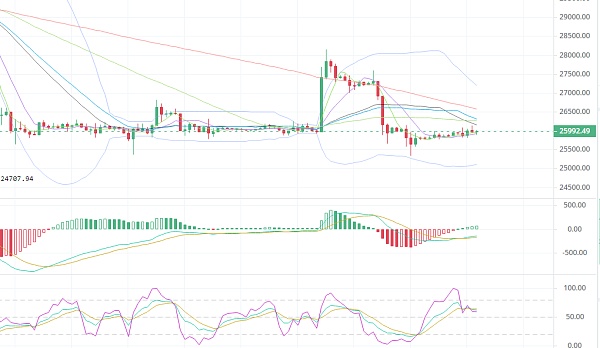 技术结构来看,日线级别中,运行通道形成缩口状态整理,价格冲高突破中轨未能有效企稳造成跳水下探,目前受中轨压制在其下方运行,均线虽有迂回之心,但多头量能没有释放之力,只能维持弱势回暖的状态,趋势上保持着弱势进行。4小时技术结构,布林带开口呈缩口,k线运行在中轨上方,多头量能逐渐放量运行,周末两天基本横盘状态,走势比较缓慢,在昨天晚间价格回撤至25787一线而后反弹,隔夜最高来到26140承压调整,多空来回拉锯选择方向,整体呈震荡,短期随着多头量能的逐渐放量,关注反弹力度,行情震荡上行的概率较大,重点关注25600此位置支撑不破多头将在次摸高。操作上保持前面低多思路即可。这里我们不跟风,坚持自己的交易理念。小仓做好防守即可,把握不准进场点位的币友可以关注九哥!