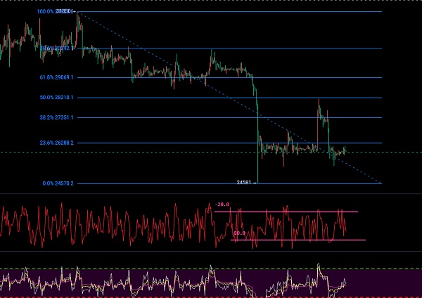 从技术面来看4小和1小时威廉指标都处于一个下跌的状态,小时线RSI更是形成了双死叉,4小时单死叉,操作现价25932都可以直接进空单,目标先看25300,止损带在23.6%的位置也就是26300。今天以空单为主!