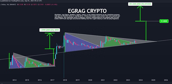 然而,令分析师和交易员着迷的是神秘的白三角。与其他形态不同的是,白色三角形向上突破,但描绘出更高的高点。这表明 XRP 的乐观前景和指数增长曲线。根据历史数据和之前的市场周期,XRP 的初始目标定为 33 美元。但热议还不止于此。预测显示,如果市场条件有利,增幅将高达 2000%,令人瞠目结舌。
