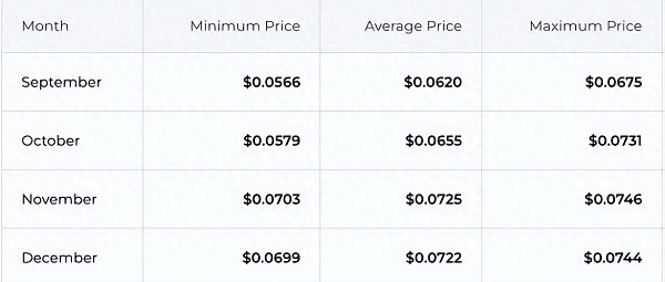 11月:根据该平台的预测,DOGE在11月的平均价格可能达到0.0725美元。11月似乎是一个相当有希望的月份,因为该资产可能上升至0.0746美元的高点或下跌至0.0703美元的低点。