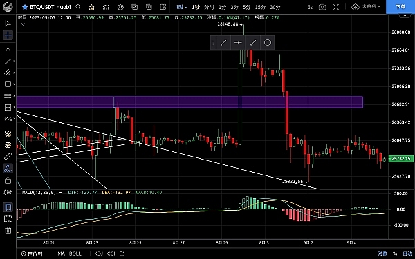大饼昨日整体呈震荡下行走势,低位跌至25563一线支撑反弹,恭喜跟上昨日思路的朋友空单获利400点,目前币价在25730附近运行,四小时级别k线收针未有效跌破25600,短期行情向上反弹,但力度不大,macd多头无量运行双线粘合,ma7向下指引,但下跌未能延续,整体走势依旧是震荡,日线级别25600支撑未破预计白盘会有反弹,但切勿追多,思路依旧是高空为主,不反弹不入场,上方压制26000-26300,下方支撑25400-25000