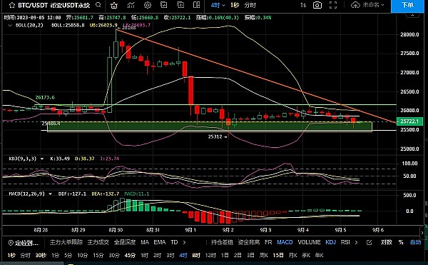 昨日,比特币处于震荡下行的走势,早晨触及26140一线后承压下跌,今日最低达到25550一线后开始反弹。从日线级别来看,昨天的K线形态呈现出连阴下跌的态势,附图MACD指标的绿色动能柱缩量运行。24小时主力资金净流出达到1.75亿美金。当前,四小时级别BOLL指数在下轨附近运行,附图MACD双线粘合运行有死叉向下的迹象,MA7和MA30均向下指引。KDJ三线死叉向下延伸态势。根据技术指标的分析,上方压制明显。我们建议采取反弹高空的策略,可以在26000-26300的价格区间入场做空,目标看向25000附近,若破位继续下看24000。