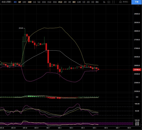 咱们从四小时图来看,布林带缩口后中上下三轨平行运行,目前形态多空上面都没有太大变化,一直处于震荡修复的状态,从中上轨缓慢向下轨下探,处于蓄势待发的阶段,K线在下轨上方位置,但凌晨插针后影线虽然跌穿了下轨,在震荡中狗庄仍然有洗盘诱空动作。KDJ三线走势相对比较弱势,RSI走势也没有明显的变化,MACD多头缩量在运行,我们可以目前短期支撑还是看25500-25300,短期压力看26300-26500,今日白盘不出意外预计还是以震荡为主,操作上以低多为主,高空为辅即可!目前币价在25700附近企稳。
