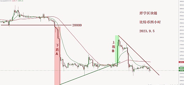 首先是下跌A,它在四小时蜡烛图收盘价跌破了关键支撑水平28800后发生,导致了一次急剧的下跌行情。