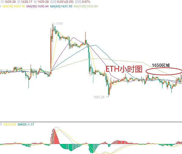 9月6日ETH合约技术面分析:日线小阴,多头缩量,大趋势下跌。阻力1650,支撑1600。小时图震荡下跌,K线连阴,附图死叉。短线策略:空1628,止损1651,目标1605-1600。