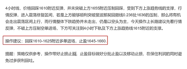 昨天长路在文章和视频中都给出,行情会有一波震荡下行,可以回踩1610附近多单介入,实时策略中也给出了相应的多单,跟上操作的朋友,多单可以拿下一波利润。