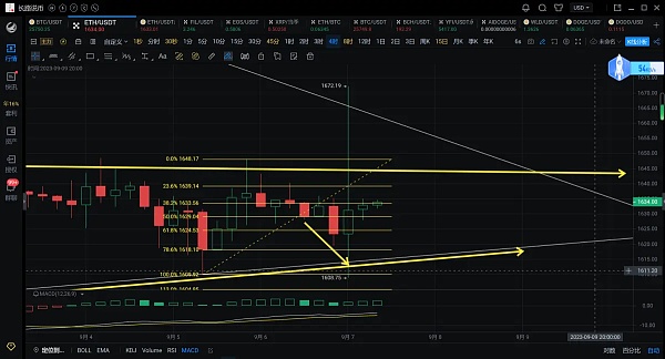 4小时线,昨天长路在视频中也有提到,行情将有一波回踩,下方可关注上涨趋势线的支撑,不跌破,可多单介入,行情如预期一般,但并未想到迅速反抽上方下跌趋势线,走出天地针的态势,而这波诱多和诱空,应该有很大一部分朋友追多或者追空了,如果你对行情把握不准,那么可以找到长路,凌晨的一波插针,并未破坏4小时线的走势,布林带仍呈现平行运行的态势,若能站稳中轨的支撑,那么将有机会去冲击上轨1645附近的压制,上方可关注斐波那契回撤线0.236处1640附近的压制,突破再继续上看,而1小时线也呈现区间震荡的态势,白盘可先看反弹,今天操作上长路建议若是再次测试日线下轨不破1600还可以多单进场,上方可关注1650附近的压制,空单将在实时策略中给出。