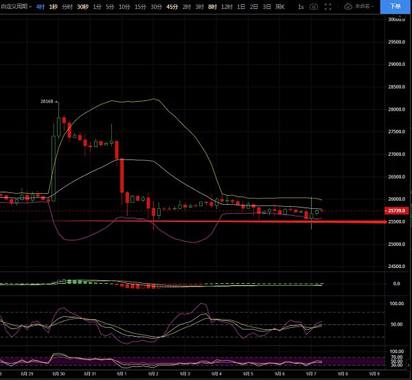 从4小时结构来看,大盘迎来横盘已久的天地针,上下波动700点左右,从目前这个k线走势上来看的话币价有意继续走高。插针之后连阳收复跌幅,现在需要留意中轨25800阻力测试变化,这种冲高后未出现收低的形态使得多头仍有延续上扬的惯性,目前盘内均线指标凌乱发散,恐怕还会伴随迂回反复的拉锯震荡节奏,进早了担心卡在中间,进晚了怕踏空,所以操作上更考验短线进场点位。