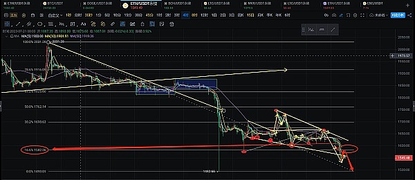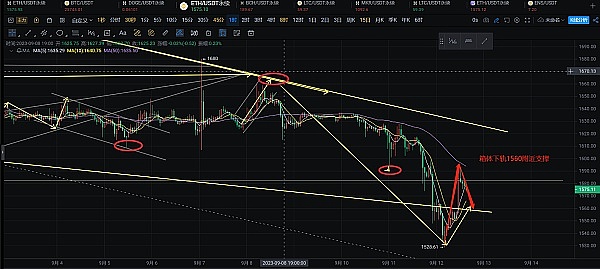ETH在多次试探上方1670压力之后昨天跌破下轨1600的支撑,最低来到了1530,小时级别来看下轨的支撑在1560,这次反弹第一压力位也在1560这里目前已经成功突破1560,