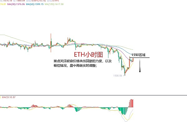 9月12日以太坊(ETH)合约技术面分析:今日方面,大周期日线级别昨日报收中阴线,K线形态连阴下跌,附图指标金叉缩量运行,价格运行于均线下方,整体大趋势走势还是偏向下跌,但是价格的延续性和力度是一直以来的问题,昨日价格承压回撤,凌晨以及今日早间支撑反弹,基本抹平跌幅,这还是洗盘的节奏;短周期小时图昨日欧盘价格下跌修正的高点位置在1600区域附近,低点1530区域,当前价格反抽当按照近期的洗盘节奏来说,上涨下跌都是难延续的,因此今日ETH短线合约交易策略:现价1590区域直接空,止损1608区域,目标看1550-1540区域;