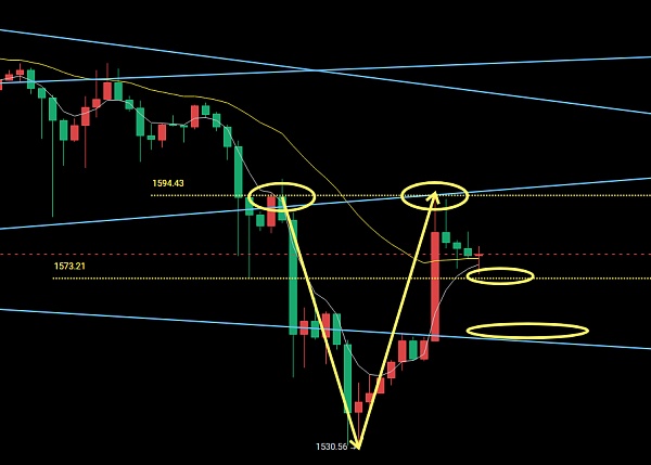 今天凌晨以太的一个低点给到,没有进行延续,之后的做单就有位置进行参考,上方压制位毫无疑问是1600的关口,下方就暂时看1530的支撑