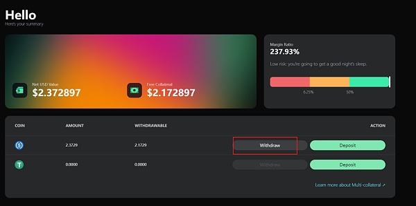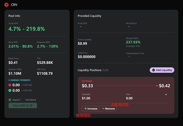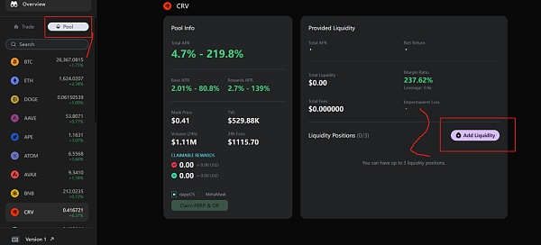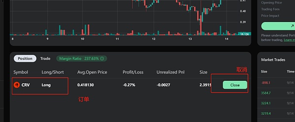 7.Deposit完成即可交互。Perp支持开合约或者组LP。再次强调,合约有浮亏时,需要补USDC保证金。目前Perp只支持市价单,没有限价单。