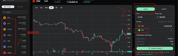 8.开合约,1.随便选择一个代币,2.选择做空和做多,3.输入金额,4.然后开始