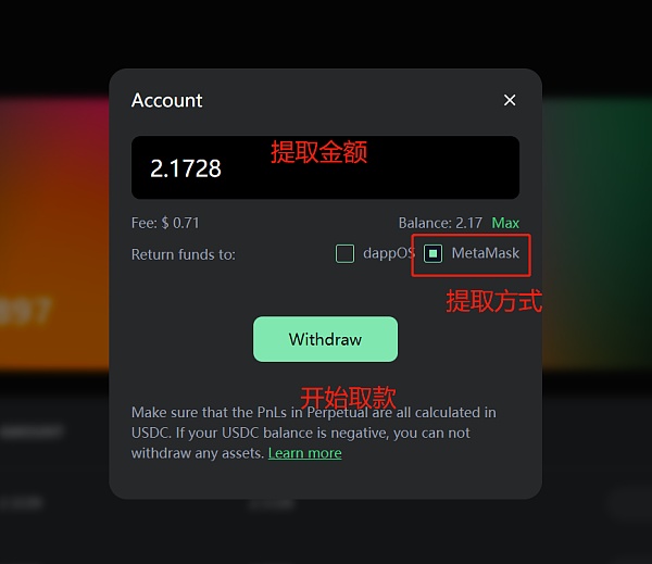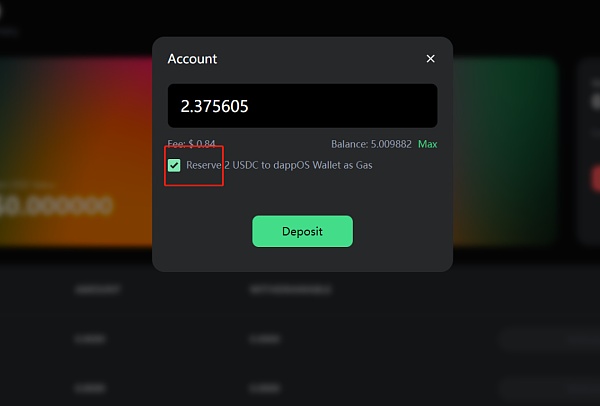 2.充值,支持USDC和USDT。注:Perp产品设计的逻辑是,如果有浮亏,会把债务计算在USDC,需补齐USDC债务后,其余保证金才能顺利提取,即使用户存的是USDT,有浮亏也需充值USDC,因此推荐只用USDC交互,避免混乱。 以USDC为例,如果你是首次交互dappOS,建议勾选绿框,预留2U到dappOS钱包,用于支付Gas