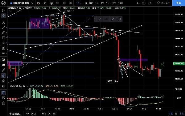大饼昨日整体走出震荡上行走势,高位触及26536一线受阻回落,低位跌至26126一线支撑,恭喜跟上昨日思路的朋友空单小幅获利,目前币价在26260附近运行,四小时级别行情突破前高迅速回落形成双顶,短期阻力区域在26600附近,目前价格回踩ma7均线未破支撑,macd多头运行双线金叉向上延伸,短期来看走势偏向多头,日线级别若实体收线在ma30上方,有机会再次反弹破位新高,若收在下方呈阴k,则初现顶部可以尝试摸顶,思路建议反弹高空为主低多为辅,上方压制26600-26800,下方支撑26000-25600