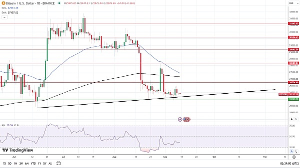 然而,如果法院批准Coinbase交易所的提案,同时驳回美国证监会的中间上诉请求,可能会显著改善市场情绪。目前,14日RSI读数为38.54,表明比特币在进一步下跌前仍有下行空间,以测试25506美元的支撑位。