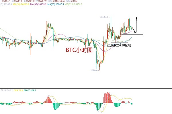 9月14日比特币(BTC)合约技术面分析:今日方面,大周期日线级别昨日报收小阳线,K线形态上连阳反抽,价格虽说还是在低位,但下方支撑位置按照目前走势老说是有效支撑了价格反弹的,附图指标金叉开始放量,这样来说后市价格还是有继续反弹的走势出现;短周期小时图从K线形态来看,近期的上涨波动幅度还是不错的,高点位置在26600区域附近,低点在24900区域附近,而当前价格在高位承压回撤向下,附图指标死叉,但不能追空了,趋势短期上下跌难有力度,而是支撑震荡上行的走势出现,因此今日BTC短线合约交易策略:回撤26000区域多,止损25700区域,目标看26500-26700区域;