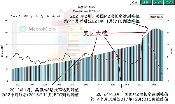 2016年10月美国M2增长率到达峰值,约14个月后(2017年12月)BTC到达峰值。