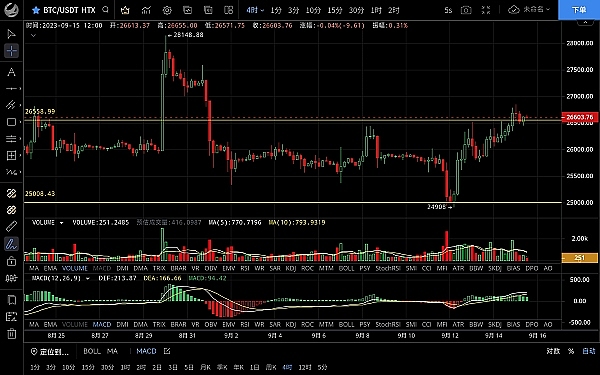 大饼昨日整体呈震荡上行走势,不断破位前高,最高触及26850一线受阻回落,低位跌至26448一线,恭喜跟上昨日思路的朋友空单小幅获利,目前币价在26570附近运行,四小时级别k线连阳沿ma7一路上行走出多头趋势,收十字星阴k,macd多头逐步缩量快线有拐头向下的迹象,短期走势出现反转,有回落需求,日线级别macd多头逐步放量双线金叉向上,多头虽强势但未能有效突破26800压制,短期力度有所减弱,激进可以摸顶,思路依旧是高空为主,上方压制26800-27000,下方支撑26300-26000