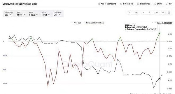 此外,Coinbase溢价指数于 9 月 13 日首次达到 0.27,呈现正值。CryptoQuant 的 Coinbase 溢价指数可以显示 Coinbase Pro 和 Coinbase Pro 上现货价格之间的百分比差异币安交易所。虽然币安在全球个人现货市场占据主导地位,但 Coinbase Pro 主要由美国机构组织和高净值投资者主导。