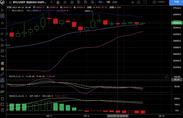 四小时结构图来看,布林带开始缓慢缩口,K线支撑于中轨,保持于中轨上方运行,日线结构来看,布林带有向上运行迹象,行情依旧在中轨的上方。k线在连收四根阳柱后,虽然昨日小幅收阴,但这只是正常的周末横磐调整节奏,MA5-MA10均线金叉向上,macd双线金叉向上,多头能量柱放量,多头依旧强势。个人观点依旧是看涨,但是周末应该是不会有什么大的变动,涨也要等周末结束,日内我们还是以观望为主