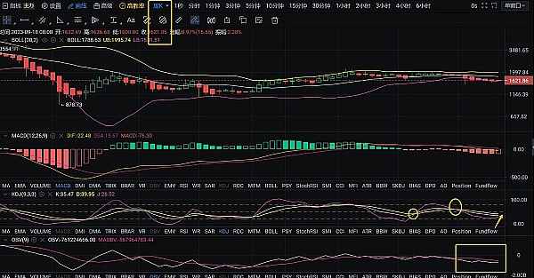 长周期周线指标来看,当前价格在布林带下轨1580附近,下方1580下轨支撑还是很强的,但多头继续向上的突破势能却不容乐观阻力较强。 MACD方面快线下穿周期线后,当前下穿角度有所收敛,开口变窄,走势上也趋于盘整。KDJ中 J线K,D周期线下方反转上行至K,D线下方逐步贴合走势。 价格走势虽然在1630附近并未向上形成有效突破,但目前底部支撑基本完成构造,等待一个向上突破的支点。
