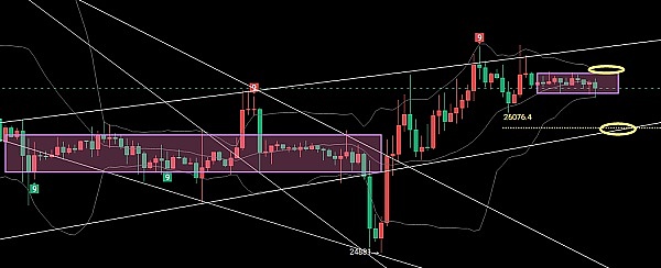 小级别均线粘合,BOLL上方缩口,高点逐步下移,下轨线26350,短期给到的是盘整形态,会依托中轨线为中间位置,进行日间的震荡吸筹,KDJ方面J线和KD即将想成死叉,至于死叉是直接拐头还是平稳向前,还是需要看能否放量,量能现在来看是有放量的迹象,已经在位放量做准备,这一根K线不放量,后面的K线也会是空头量能,达成阴跌情况,MACD目前也是0轴下方,空头多于多头