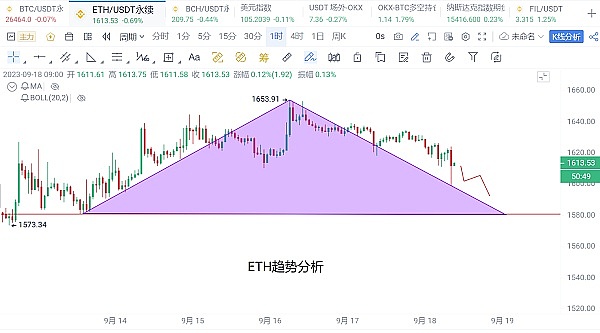 这两天行情处于阴跌,早间就开始急剧破位,以太最低来到1600以下,不过是快速插针导致的,既然有破位迹象,我们操作多头一定要保持谨慎,不出意外还会震荡往下走。日线方面以太跌破布林带下轨,收线在1630以下,大饼比较抗跌,下滑只有100多点,所以短期大饼行情稳定。指标方面KDJ快线回落,上方压力逐步出现,空头开始放量,整体思路高空为主。