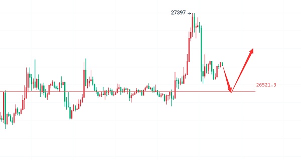 昨天比特币布局的空单比较可惜,严格来讲是刚刚摸到止损位置再下跌, 今天日线上符合昨天的预期,整体上多头发散,下方支撑关注26500-26100。短线四小时上情况,继续维持在boll上涨通道中,macd多头量能急速下跌,kdj快线马上触及20一线,四小时整体保持看一个回撤寻找支撑继续看涨。一小时上压制还是在昨天秦川所说的26900附近。综合上述情况建议日内回调做多。