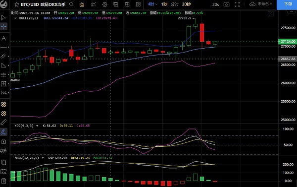 四小时结构图来看,布林带向上收口运行,行情冲高受压回落走出三连阴止跌继续试探中轨支撑位,经过昨晚震荡拉锯走势后直到今日凌晨走出小幅回调,目前行情的跌幅并没有形成延续,而是企稳在中轨上方运行,日线结构来看周一继续延续上周的走势,继续冲高后回调,收上引线阳柱。虽然目前多头情绪高涨,但从整体来看并未走出明显的单边形态,目前我们看震荡高点27700附近能否突破,突破企稳即可继续上看。短线上在没有打破区间之前,就目前行情而言我们还是保持回调做多的思路!