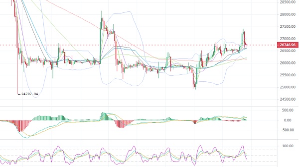 比特币在近期的节奏中连续的走高,昨日晚间直接站稳27000关口上方,最高来到27400一线后承压回落,而凌晨也是走了一定的回落空间,目前涨幅还是未能得到延续,最终还是回到27000下方,那么在操作上可以高空低多思路进行对待即可。把握不准进场点位的币友可以关注九哥,接下来我们看看盘面情况。