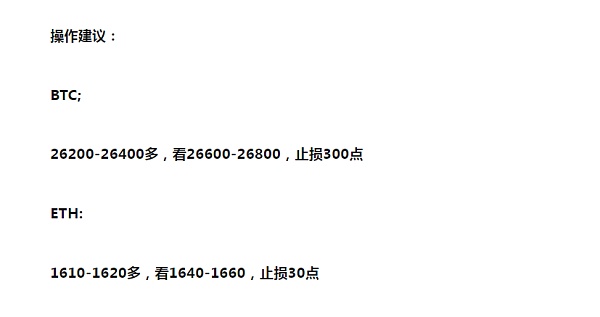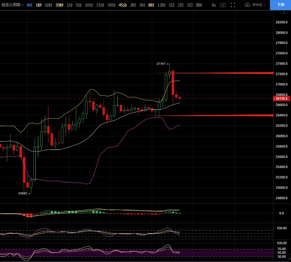 从四小时来看,反弹必伴随着回落,行情突破上轨后,缓慢回落中轨企稳,说明下方支撑强劲,K线走势画门,目前布林带开口后平行,下方KDJ三线交叉向下运行,RSI三线走势在30-70之间,目前MACD多空能量柱交替,多头强过于空头,目前各项指标可以表示行情短暂回落修整,修整结束开始反弹,目前短线高点已破位,行情虽没有完全收腹前期的下跌失地,不过也只是一个时间上的问题。短线来看只要回撤不跌破26400附近都可以做多,此位置也可以作为短期内的支撑,压力也是27400附近。操作上低多为主高空为辅进行即可!